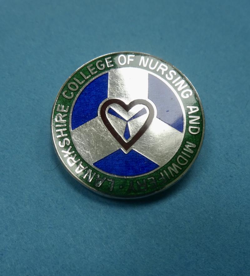 A silver and enamel enrolled Nurses badge from the Lanarkshire College of Nursing and Midwifery.The design features a red enamel heart in the centre of an inverted silver Y on a blue background.The green edging carries the title Lanarkshire College of Nursing &and Midwifery.In good condition but with some minor surface scratches.Pin,Clasp and safety roller catch are all good.Makers marks for V&S .Silver hallmarks for 1983.