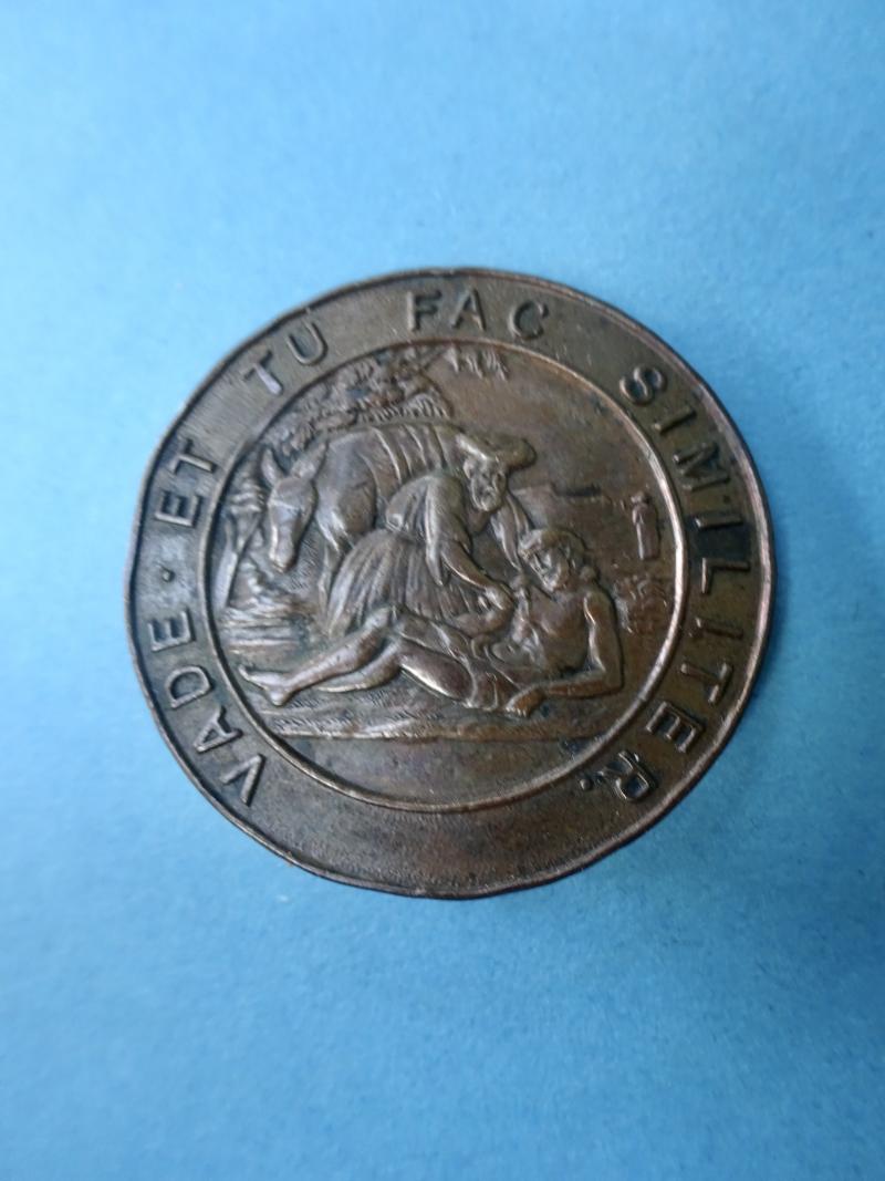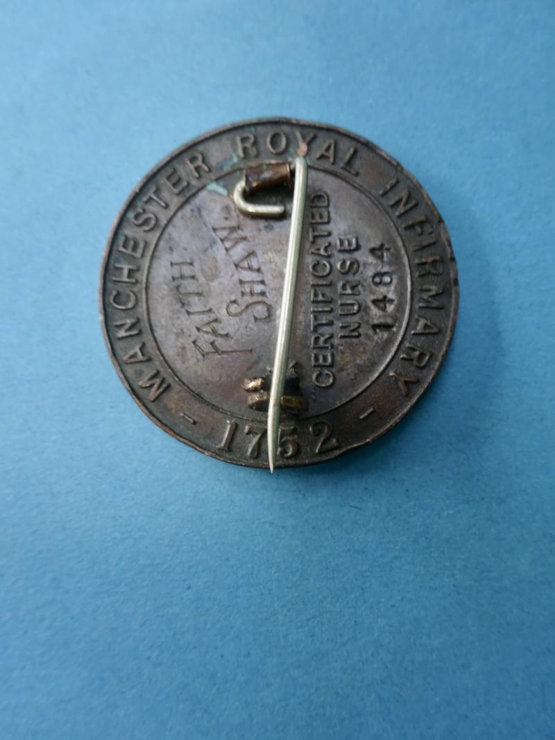 The ever popular and large' Good Samaritan Penny' badge from the Manchester Royal Infirmary.It features the Good Samaritan attending the injured traveller in relief around which is the motto Vade Et Tu Fac Similiter-Go and Do Likewise.The rear is engraved to Faith Shaw Certificated Nurse 1484 Condition is good with unpolished patina to face.Pin & Clasp present. but safety catch is missing.