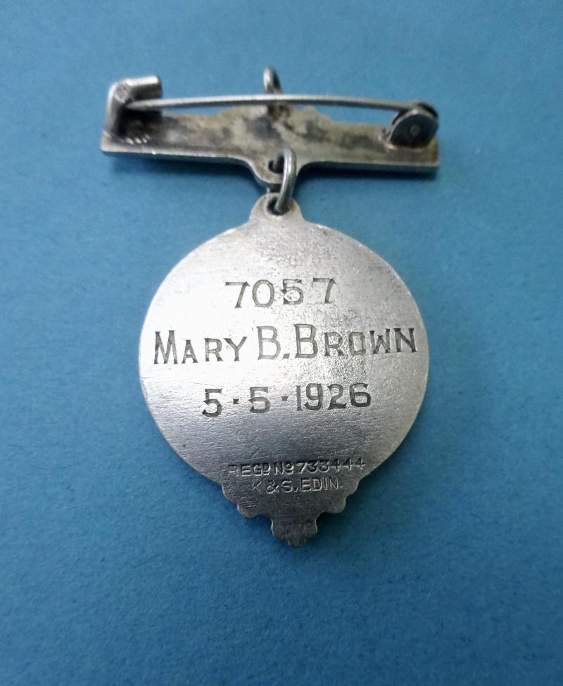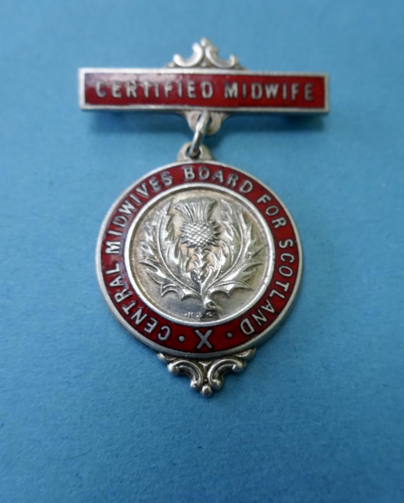 This pendant badge was awarded by the Central Midwives Board For Scotland,originally in this red enamelled finish but from the late 1940s in a blue enamel version.The design was changed again in 1962 .It consists of a Thistle ,the symbol for Scotland with a red enamel border.The suspension bar bears the title Certified Midwife.In silver plated metal,this badge retains its original finish with only minor signs of wear .Pin and clasp good ,with a suspension ring for a safety chain if required.Engraved to the rear 7057 Mary B Brown 5.5.1926 with maker mark for K&S Edin.(Kenning & Spencer)Height 43mm