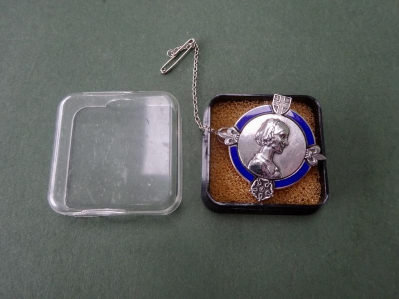 Its central motif is a profile of Florence Nightingale wearing her lace cap.At the top is the arms of St Thomas with a Fleurs de Lys.Conditon is good with only minor scratches each side and a rose to the bottom. Pin Clasp and safety roller catch are all good,Silver safety chain is in situ. In its original plastic presentation case by Thomas Fattorini.