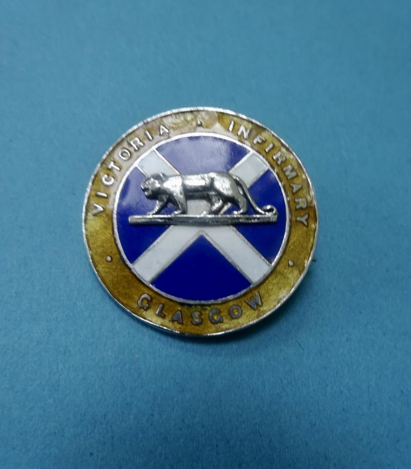 A pair of silver nursing badges awarded to the same nurse for her training in Glasgow in the 1970s. The first is a silver and enamel "Puma" nurses badge from the Glasgow Victoria Infirmary.It's two piece composite design features the Puma ( taken from a moulding on the external wall of the Hospital) on a Scottish saltire cross, within a band containing the hospital name.The condition of the enamel is fair but with enamel chips around the rim,as pictured.Pin and clasp are damaged but intact ,but safety catch is missing