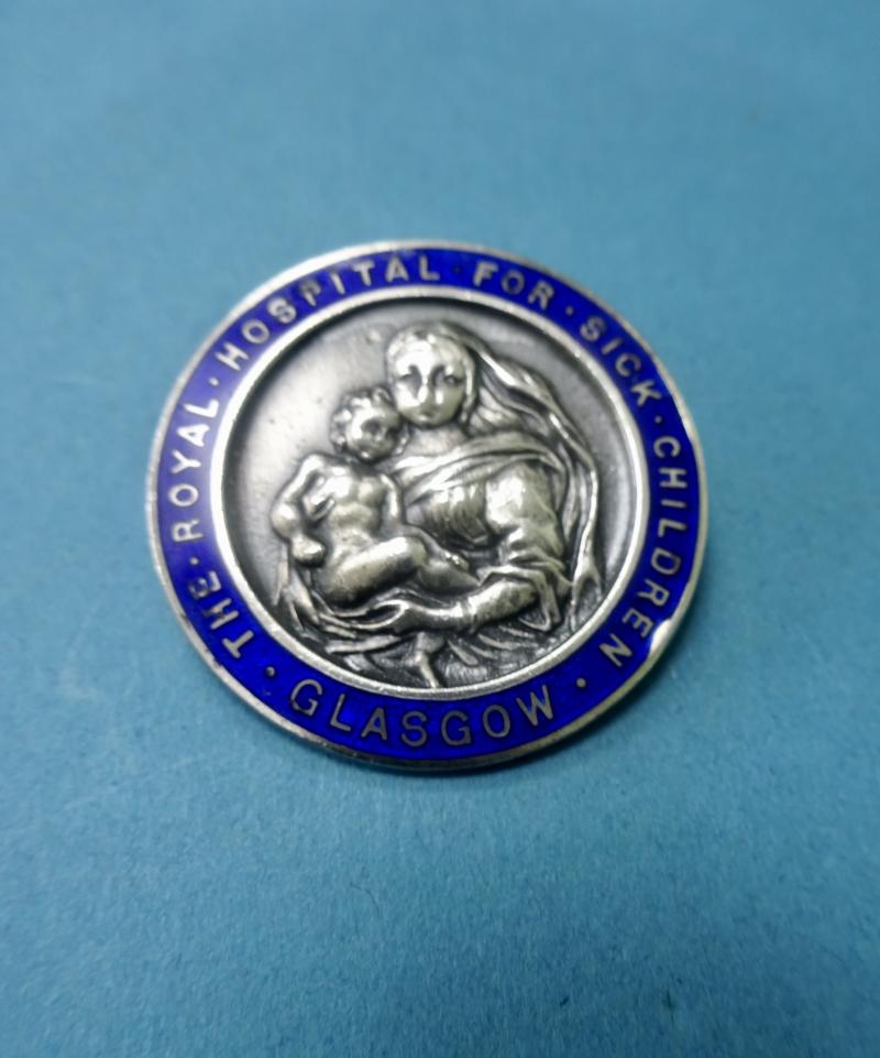 The second is a Silver and enamel badge for The Royal Hospital for Sick Children Glasgow.This version with blue enamel is for a staff nurse .Featuring the Madonna and Child in relief.