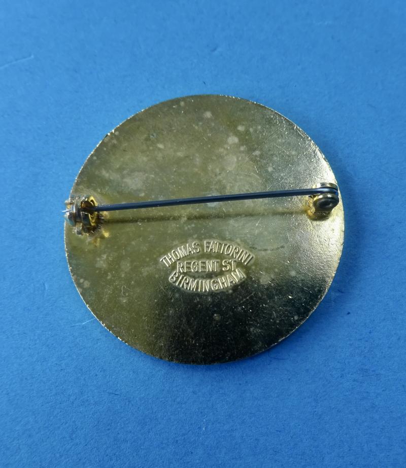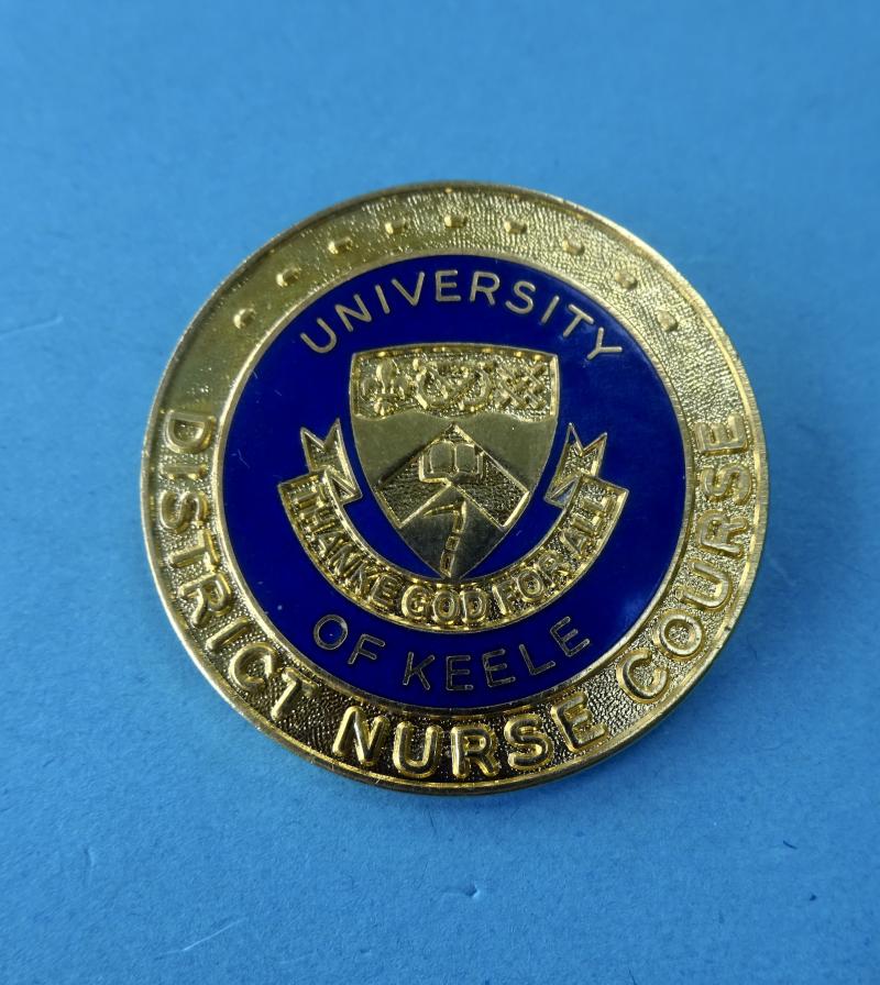 A base metal and enamel badge from the Keele University in Staffordshire,for their District Nurse Course.The design features the arms of the university in gold on a navy blue enamel background.Condition is very good with pin clasp and safety roller catch all in good order.Makers mark for Thomas Fattorini Regent Street Birmingham.Height 35mm