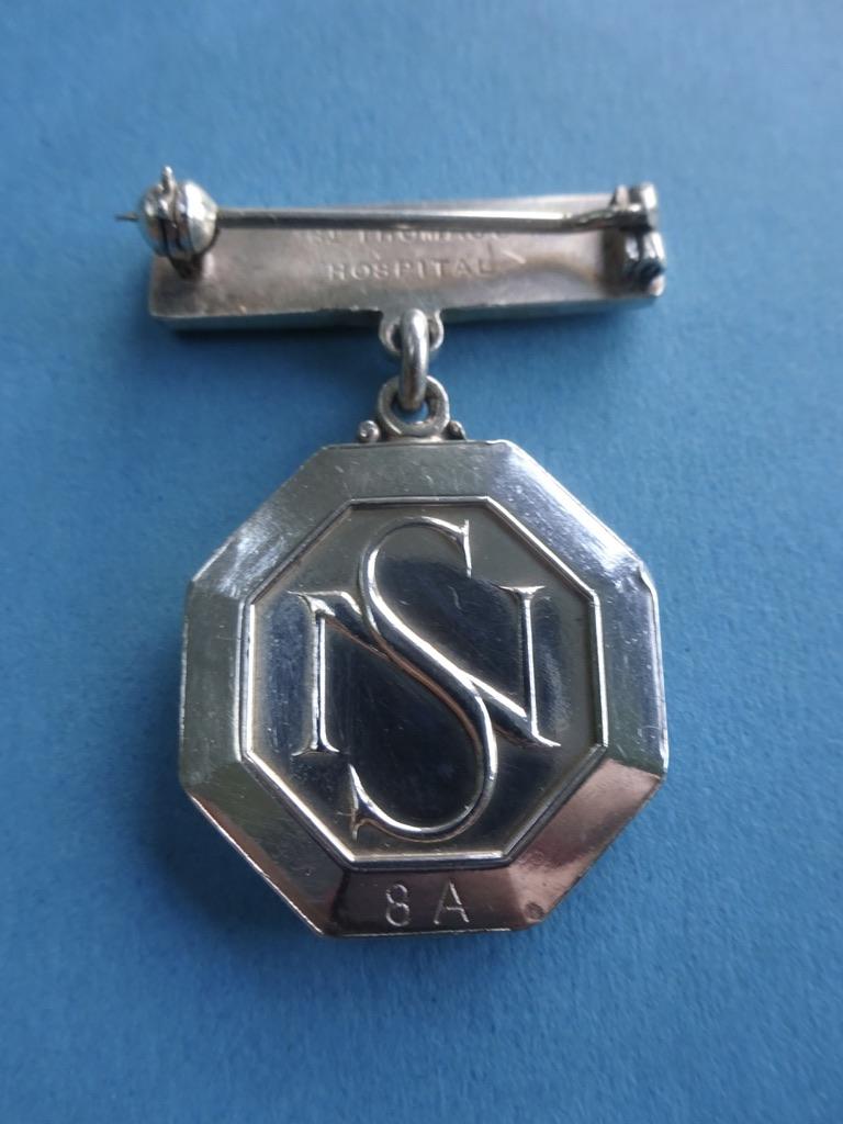 Another scarce badge from the famous Nightingale School of Nursing.This one is a white metal pendant badge awarded for the Post Basic courses run by the school. The octagonal badge bears the crest of the hospital and is suspended from a small pin back bar brooch(on some versions a coloured bar is added to this denoting the relevant training course ) The rear has the monogram NS for Nightingale school and below this is a number which,I believe, also corresponds to the English National Board number of course completed. In this case it is 8A but I have not been able to identify this. The rear of the suspension bar is engraved St Thomas's Hospital.Good overall condition but with some surface scratches and minor wear.The pin clasp and safety roller catch are all good.