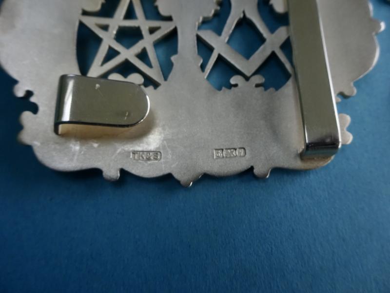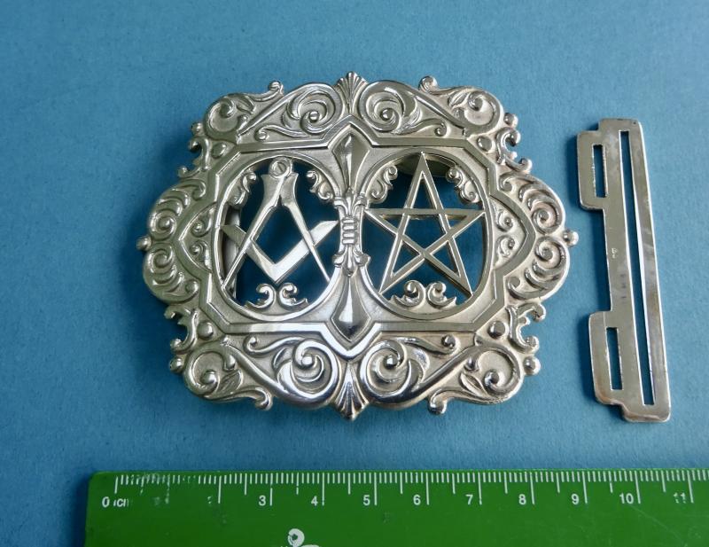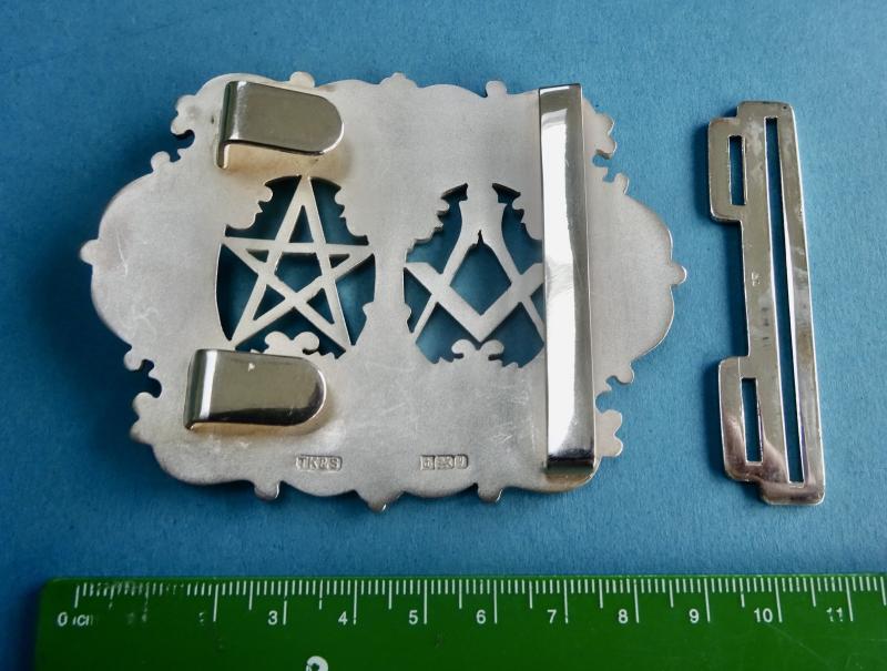 A scarce and desirable two piece nurses belt buckle from the Royal Masonic Hospital.The main body of the buckle consist of a heavy convex scrolled design into which are set two panels in a voided centre.The first bears the square and compass,the second the five pointed star,both masonic emblems.This is a slightly later version of the belt which was awarded to nurses qualifying from the Nurse Training School,and is slightly chunkier than the earlier models.The second piece is the buckle clasp.Both pieces are hallmarked for Toye,Kenning & Spencer,Birmingham 1984.The rear is unnamed. Height 70mm Width 89mm