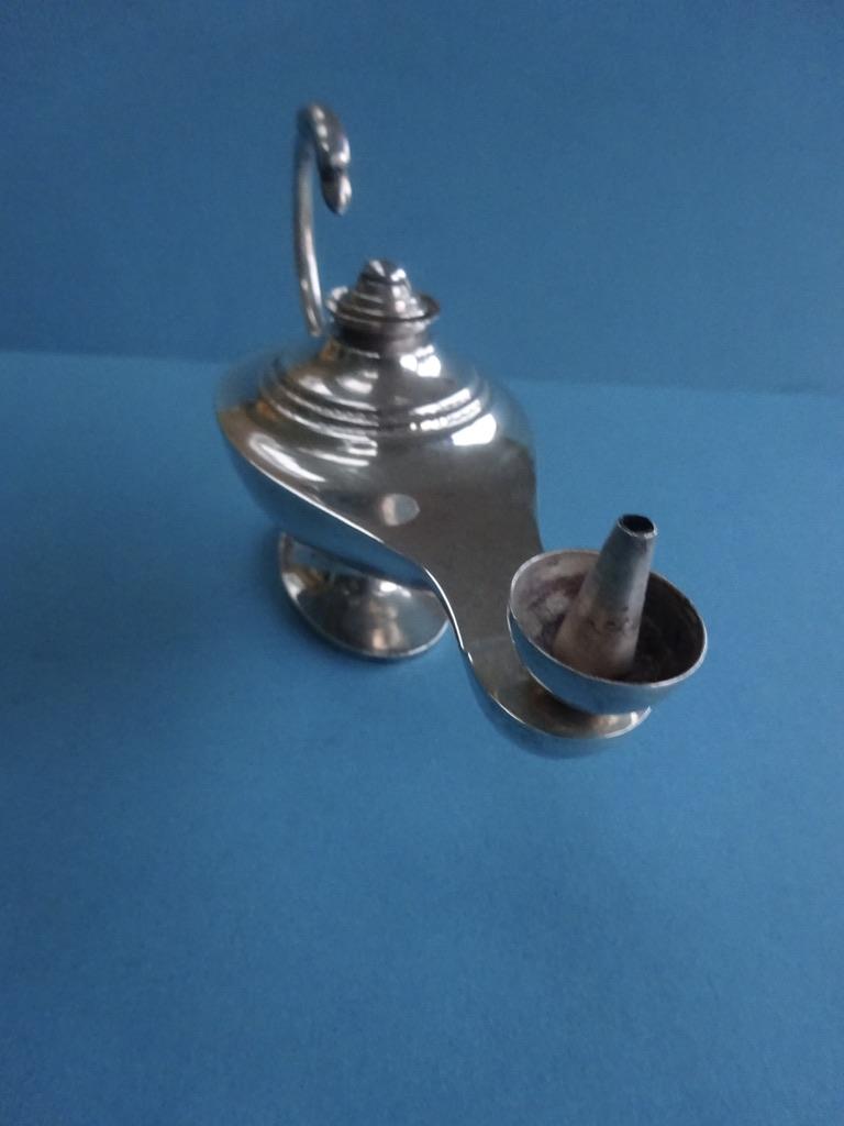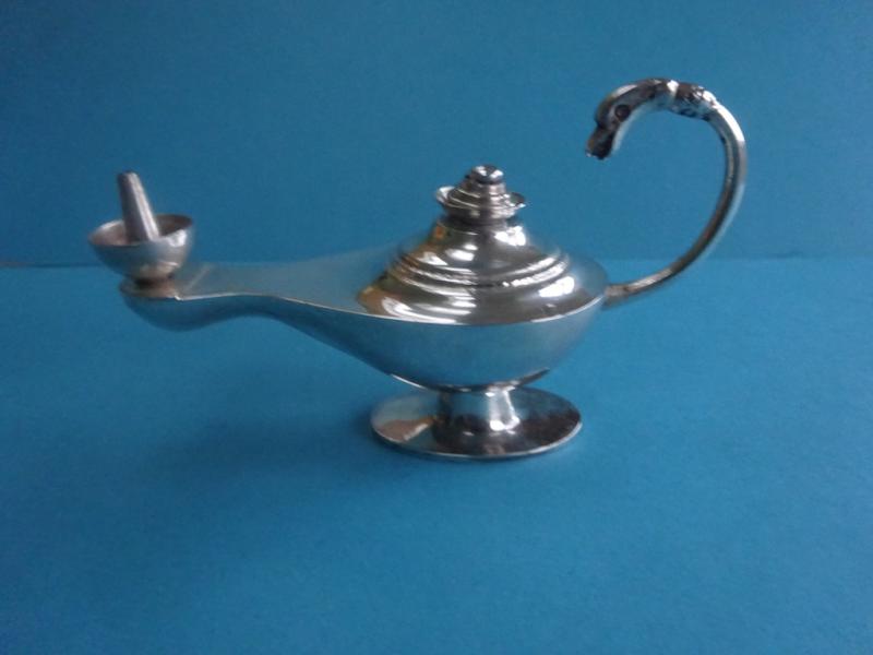 A lovely solid silver Aladdin style lamp,also known as the Lamp of Learning. A smaller version of the type of Lamp used in the annual Florence Nightingale Commemoration Service at Westminster Abbey.In America many schools hold a Lamp Of Learning ceremony and small china versions are given as graduation gifts.This one has a handle in the form of a snake, an emblem of healthcare