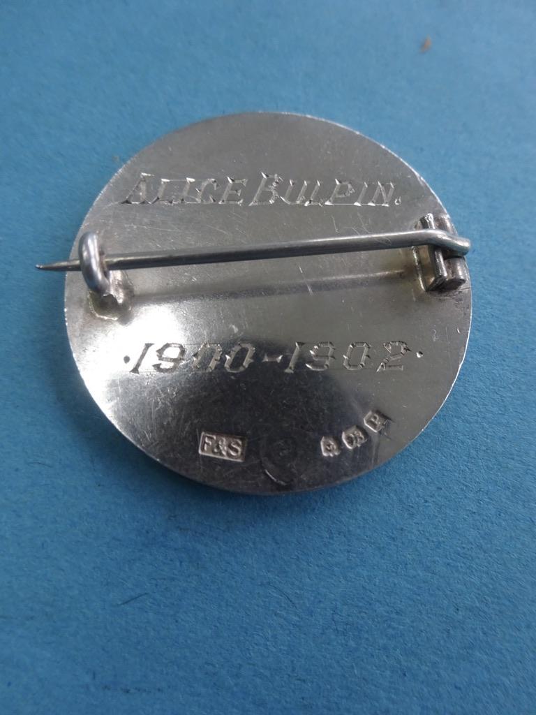 A silver and enamel Nurses badge from the Gloucestershire Royal Infirmary.It consists of the intertwined initials GRI with the Hospital title in silver on green enamel border.Very good condition with pin and clasp good.Engraved to the rear Alice Bulpin 1900-1902. Silver hallmarks for Fattorini & Sons Birmingham 1939 which suggests this badge may have been issued retrospectively many years after the training. . Height 32mm