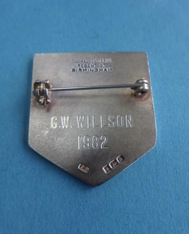 Another Nice silver and enamel Badge for the Brent & Harrow School of Nursing from the 1980s. It depicts the Brent Goose,Harrow on the hill and the Hart of Hertfordshire.In dark blue enamel it is in very good condition.Pin and safety catch intact.Hallmarked for TF Birmingham 1982,makers mark Thomas Fattorini Regent Street Birmingham. Engraved to rear G W Willson 1982