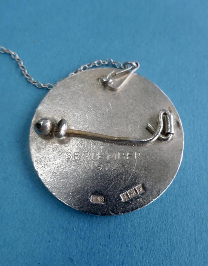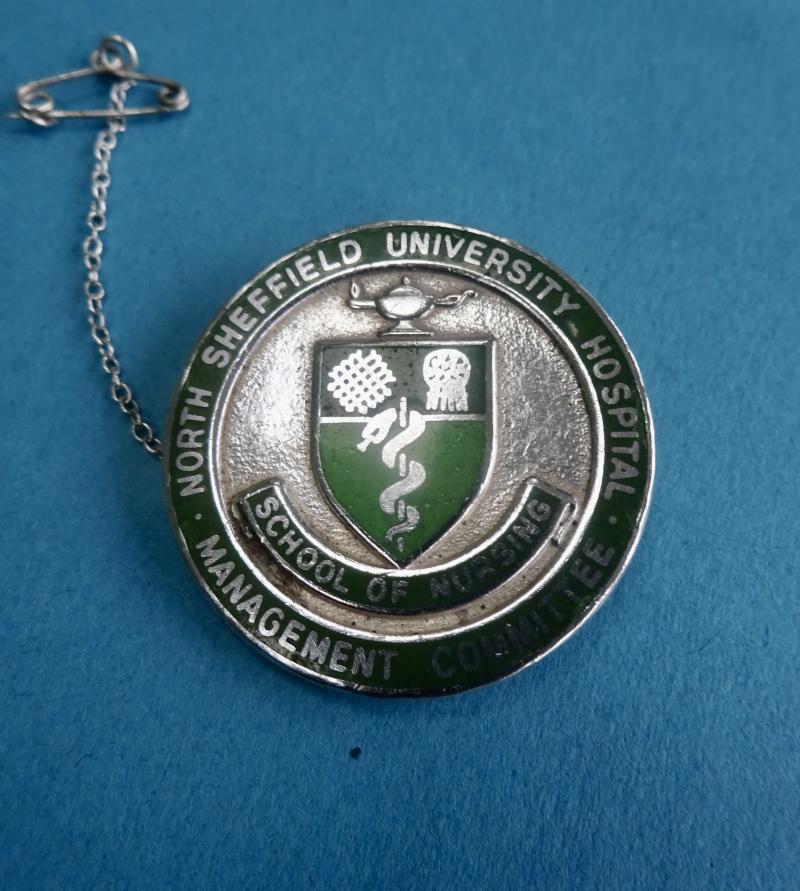 A silver and enamel nurses badge from the North Sheffield University Management Committee School of Nursing.I believe the green colouring denotes Enrolled Nurse Training.In good condition with minor enamel scratches. Pin is a temporary replacement and clasp damaged minus safety Roller catch.Unable to be worn in current condition.Engraved for J Kingston September 1972. Hallmarked for F&S Birmingham 1971.height 31mm