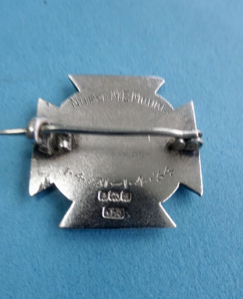 A nice clean silver and enamel Nurses badge for the Chester Royal Infirmary Training School.It's central emblem is the wheatsheaf of Cheshire.,this being circled by the Hospital title in silver on dark blue enamel.This is imposed upon a silver cross pattee.The condition is very good with minimal surface scratches.The pin and clasp are all good.It is engraved to Nurse M E Moore 1.4.31- 1.4.34.It is hallmarked for JF for Birmingham 1933.Height 27mm