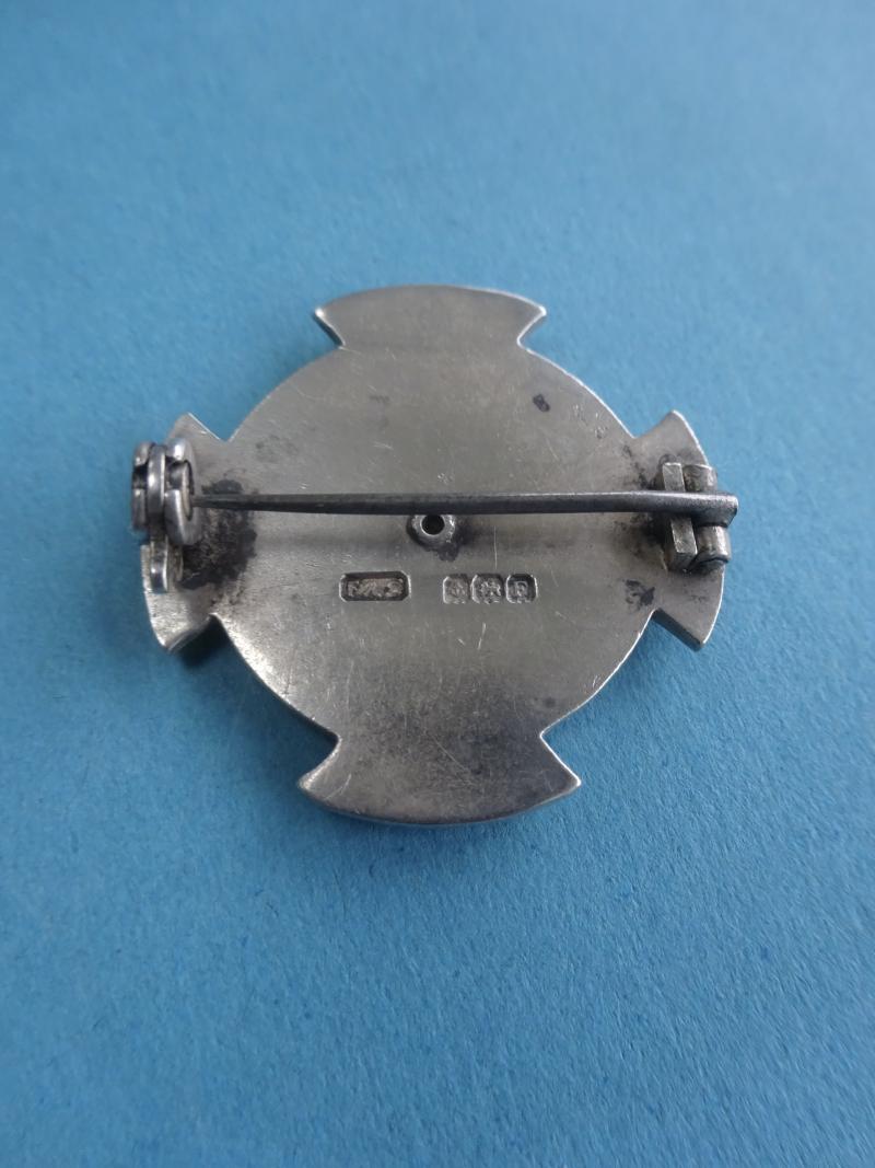 The badge features the LCC crest upon a silver roundel within a blue enamelled cross. The enamel on the cross looks to be poorly restored .The LCC crest is intact.The pin and safety catch are intact and the badge carries hallmarks for 1931 and makers marks for Fattorini & Sons.Height 30mm