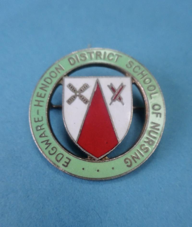 A Base metal and enamel Badge from the combined Edgware Hendon School of Nursing,dating to the 1970s.In excellent condition as pictured.Pin and clasp intact.Unmarked to rear.
