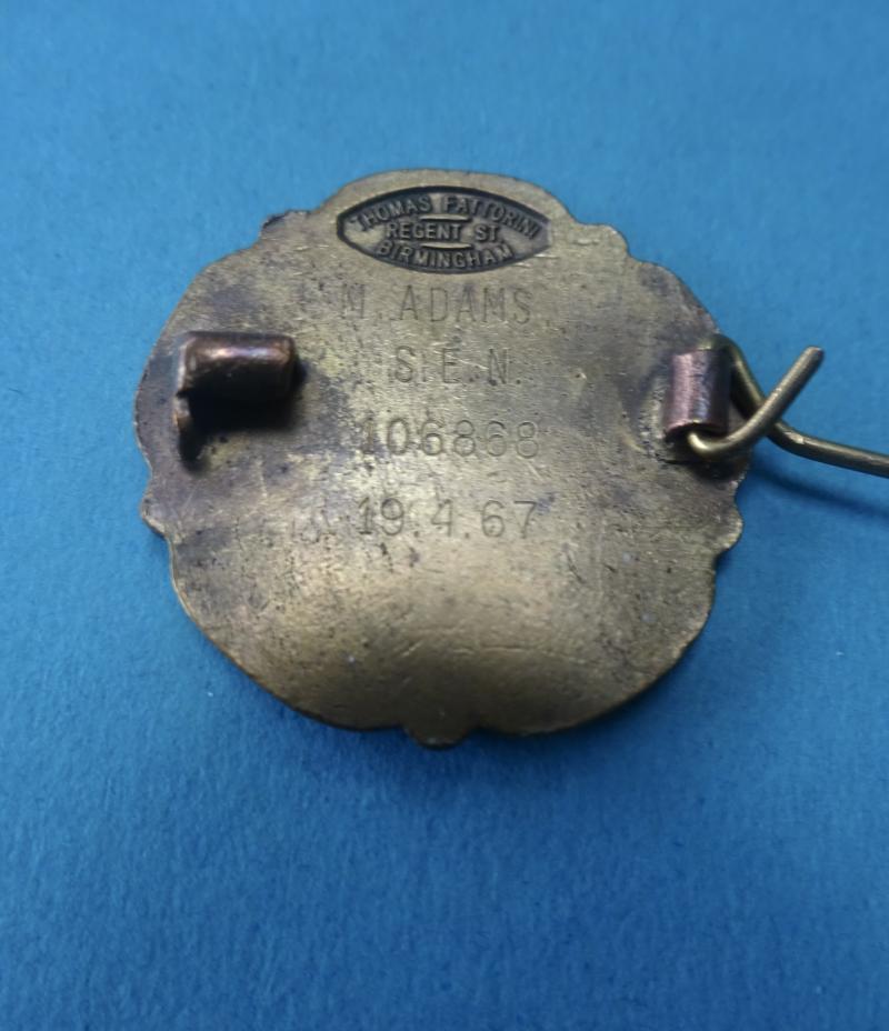 A good clean bronze and enamel State Enrolled Nurses badge from the General Nursing Council for England & Wales.In generally good clean condition .Pin, clasp and safety roller catch are good.Makers mark for Thomas Fattorini Regent street Birmingham,Engraved for M Adams SEN 106868 19.4.67 .Miriam Adams is shown as having trained at City General Hospital Carlisle