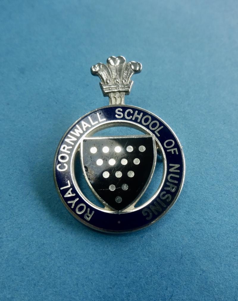 A Silver and enamel Nurses badge for the Royal Cornwall Infirmary in Truro.It features the shield bearing the arms of the Duke of Cornwall and is surmounted by the Prince of Wales feathers.It has Birmingham hallmarks for 1978 and makers marks for Vaughton & Son.The pin is intact and it has its retaining catch.very good condition Height 42mm.