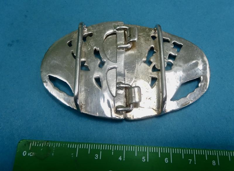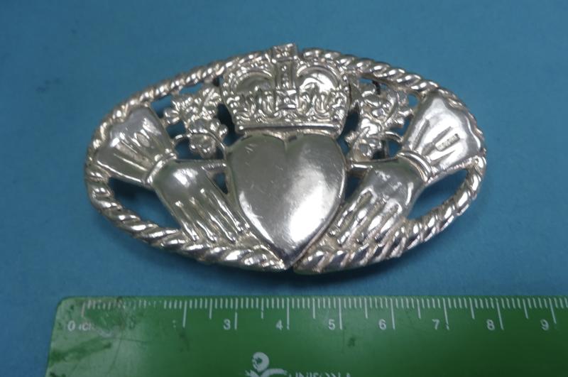 A lovely silver belt buckle in the form of the Irish Claddagh ring or brooch.This has three symbolic elements which are the Heart which denotes Love, the Crown denotes Loyalty and the Hands are a sign of Friendship. Often given as a token of love by the family , partner or friend. The dimensions are width 85mm height 55mm Weight 75gms . Belt loops and clasp are good.Hallmarked PM Ltd Birmingham 1993