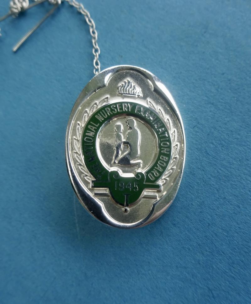 A silver and enamel badge for the National Nursery Examination Board.In excellent condition, pin & clasp are all good.Makers mark for Thomas Fattorini Regent Street Birmingham.Silver hallmarks for TF Birmingham 1975.Height 29mm