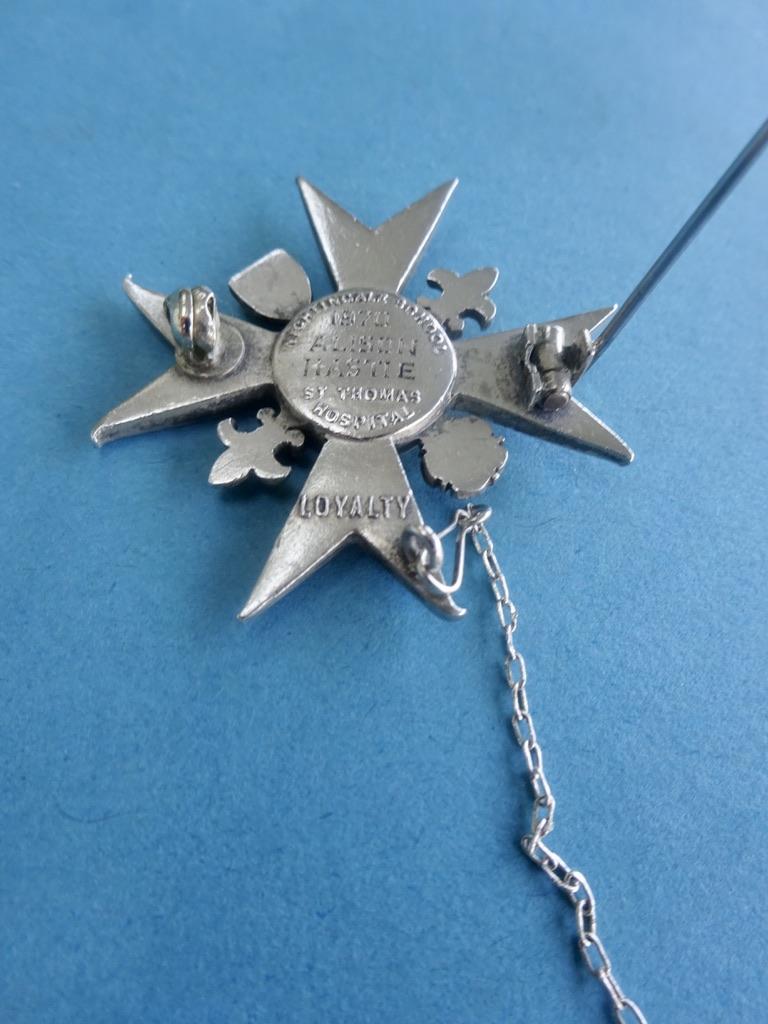 The pin, clasp are intact but the safety roller catch is absent and should therefore not be worn until replaced .It is engraved to the rear Nightingale School St Thomas Hospital 1970 Alison Hastie