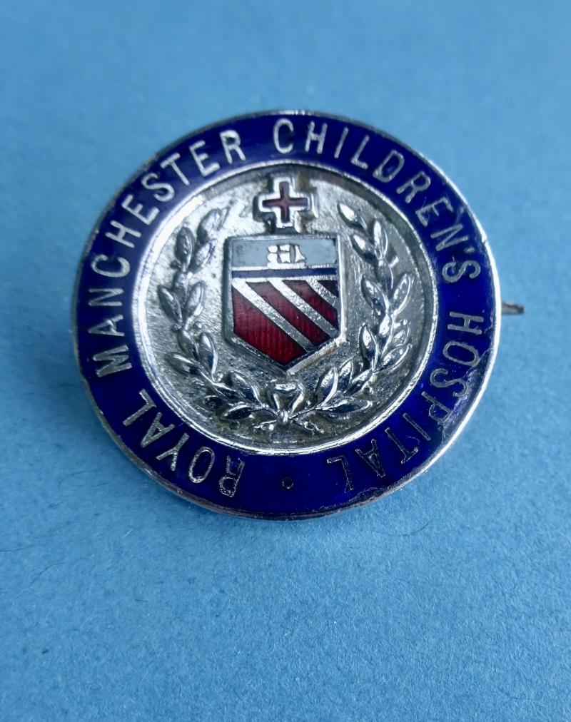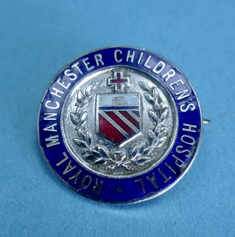 A base metal and enamel badge for the Royal Manchester Children's Hospital from the 1950s.The central device is a shield bearing then arms of Manchester topped by a small Red Cross, within a laurel wreath. Good overall condition but with some loss of chrome to the rear.Marked to the rear 371 McLoughlin S. Certificated Nurse.This is Sheila McLoughlin RSCN 8438 who qualified 27.11.31 from The Royal Manchester Children's Hospital Pendlebury.