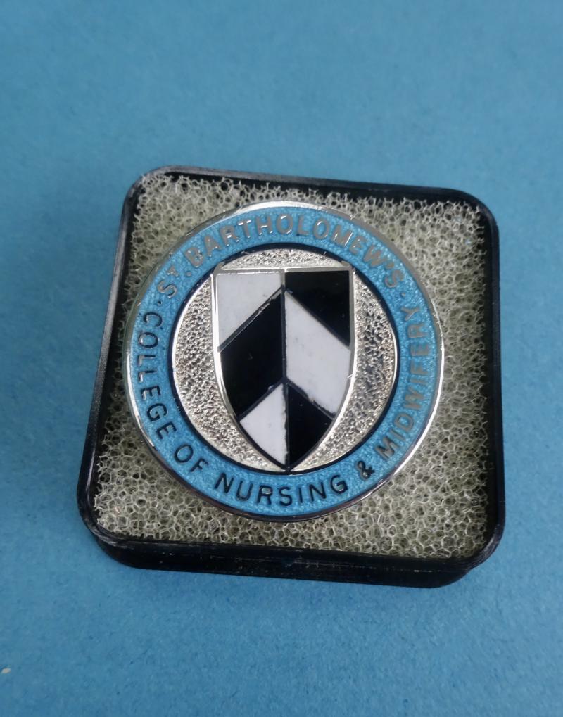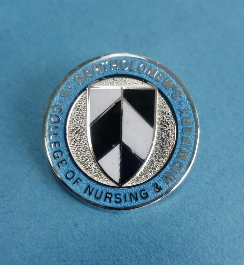 A popular badge for St Bartholomew's College of Nursing & Midwifery which features the famous black and white Wakering shield .This particular wording was in use from 1987 to 1996 when it was replaced by the City University/St Bartholomew's pattern. In excellent condition with pin,clasp and safety roller catch all good .In its original plastic presentation box by Thomas Fattorini.