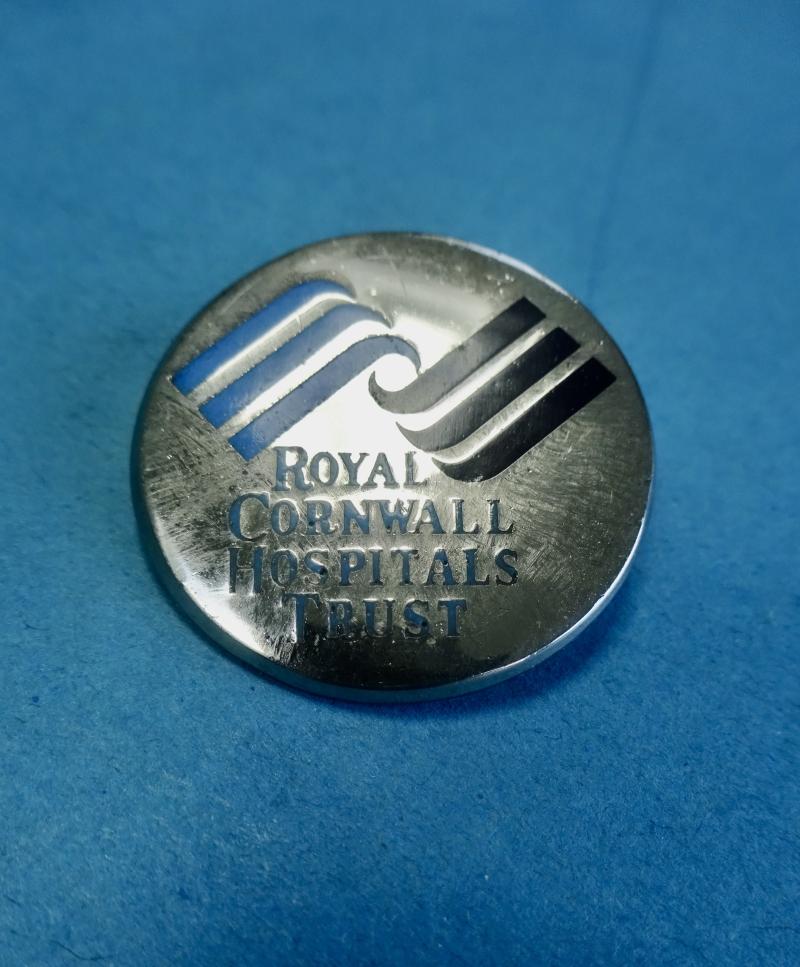 A modern staff member badge for the Royal Cornwall Hospitals Trust. Pin back fixing in good order.