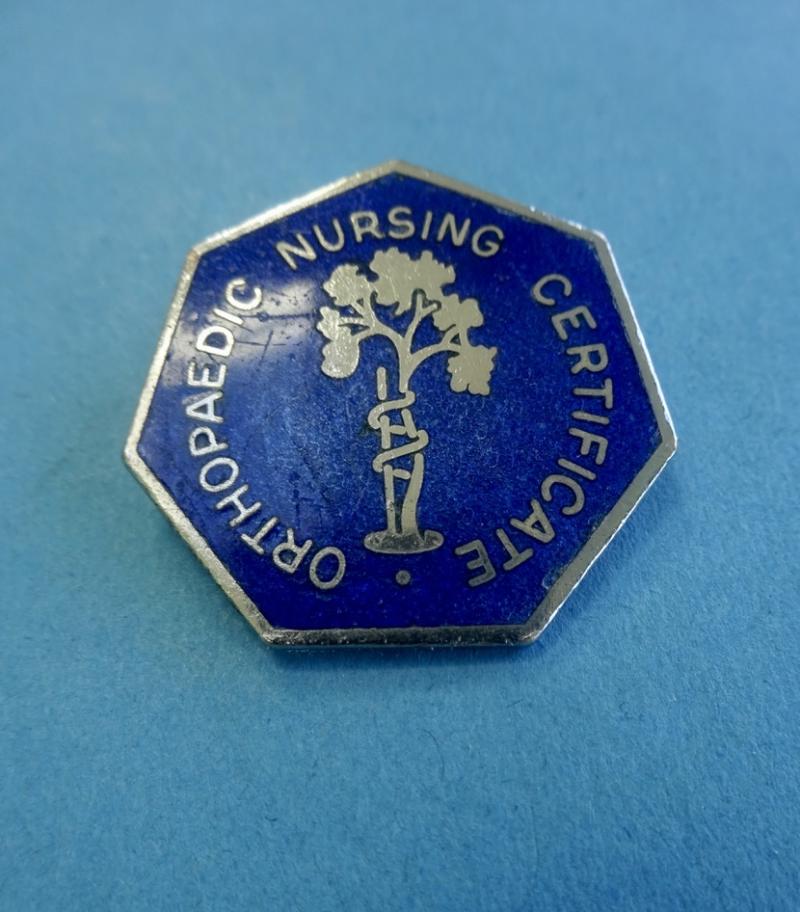 A popular seven sided enamelled nurses badge for the Orthopaedic Nursing Certificate.First issued in 1974 it features a twisted plane tree with it's trunk bound to a post, an allusion to a splinted fracture.The badge became obsolete in 1983 with the formation of the UKCC.Very Good condition but with only minor enamel scratches .Pin and catch intact .Makers marks for Thomas Fattorini Regent Street