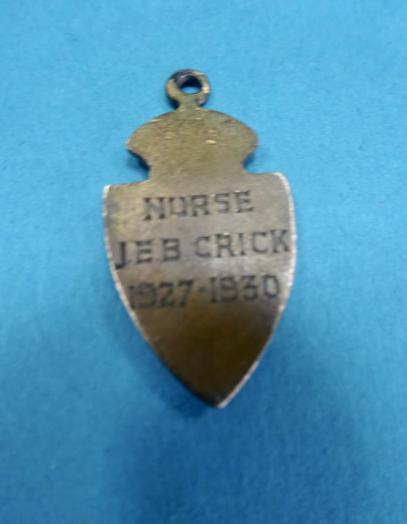 A scarce early nurses badge for the Royal Victoria Hospital Folkestone.The small pendant badge was originally suspended from a brass safety pin type fixing but this is missing It takes the form of a blue enamelled shield with a crown, bearing RVHF .Named to the rear for Nurse JEB Crick 1927-1930. This appears to be Jessie Emmeline Back Crick, who is recorded in the Members roll of the College of Nursing as having qualified from the RVH in 1930.