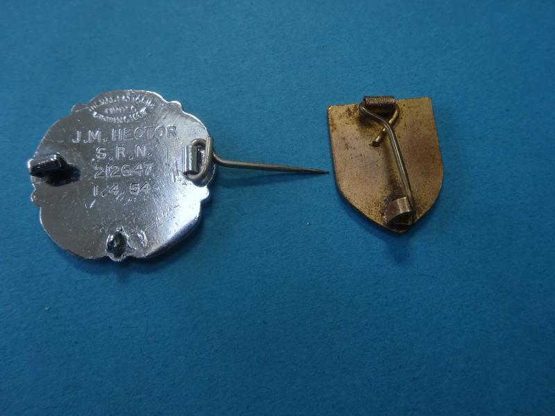 The first is a chrome plated and enamel badge from the General Nursing Council for England & Wales. This is named for J M Hector SRN 212647 1.4.54 (Judith Mary Hector, is shown in the register as having trained at Rowley Bristow Orthopaedic Hospital,Pyrford ,later transferring to St Thomas Hospital London.)