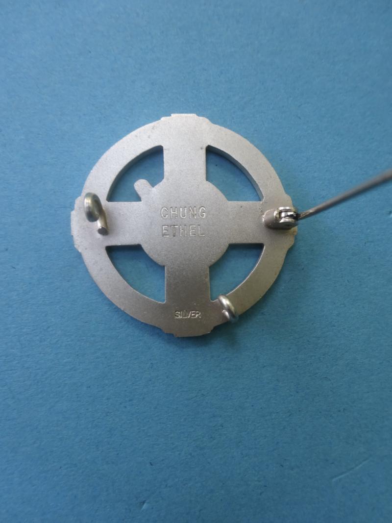 A silver and enamel Midwives badge from the Dartford Midwifery Training school.The badge features a Red Cross Circelee within a blue circle voided. The genre bears black bird on a white centre, representing the Dartford Warbler associated with the area.Very good condition with pin and clasp intact. Named to Chung Ethel, marked silver.