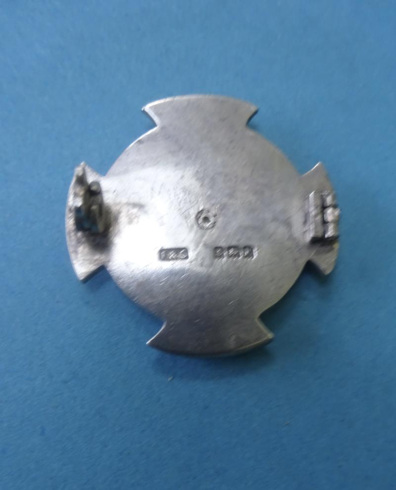 The badge features the blue enamelled cross with central shield bearing the LCC crest,this one on a silver background.There is some minor damage to some edges of the enamel on the arms of the cross, please refer to pictures.The crest is good.The catch and safety roller are present but the pin is missing .Silver hallmarks for Fattorini & Sons,Birmingham 1931.Height 31mm