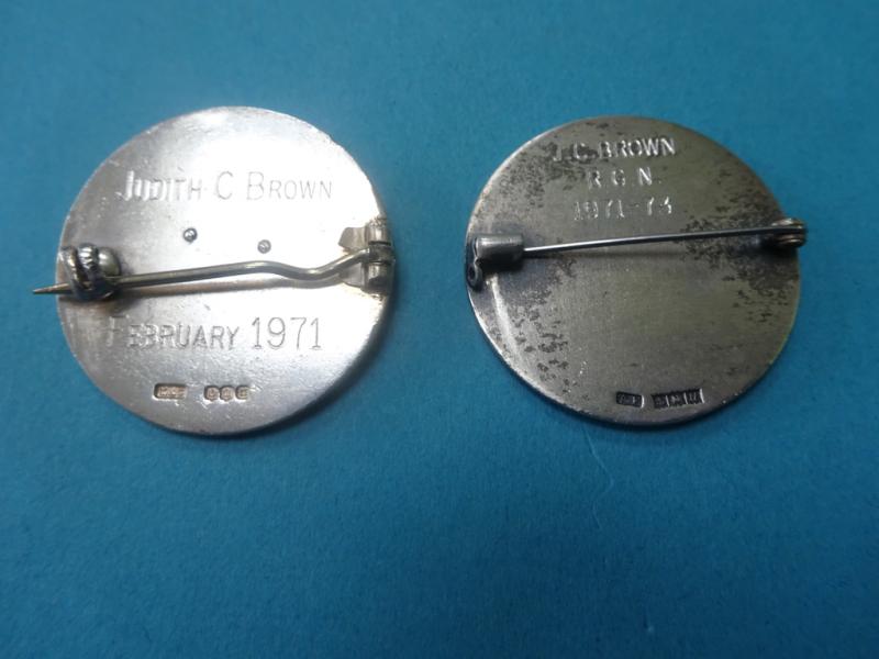 The badge is in good condition with pin and clasp intact.There is very minor surface wearing one small ding to the edge.Named for J C Brown RGN 1971-73 .Hallmarked silver for Birmingham 1969 makers Thomas Fattorini. Height 32mm