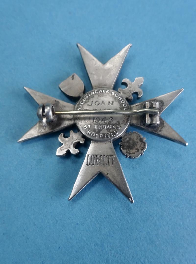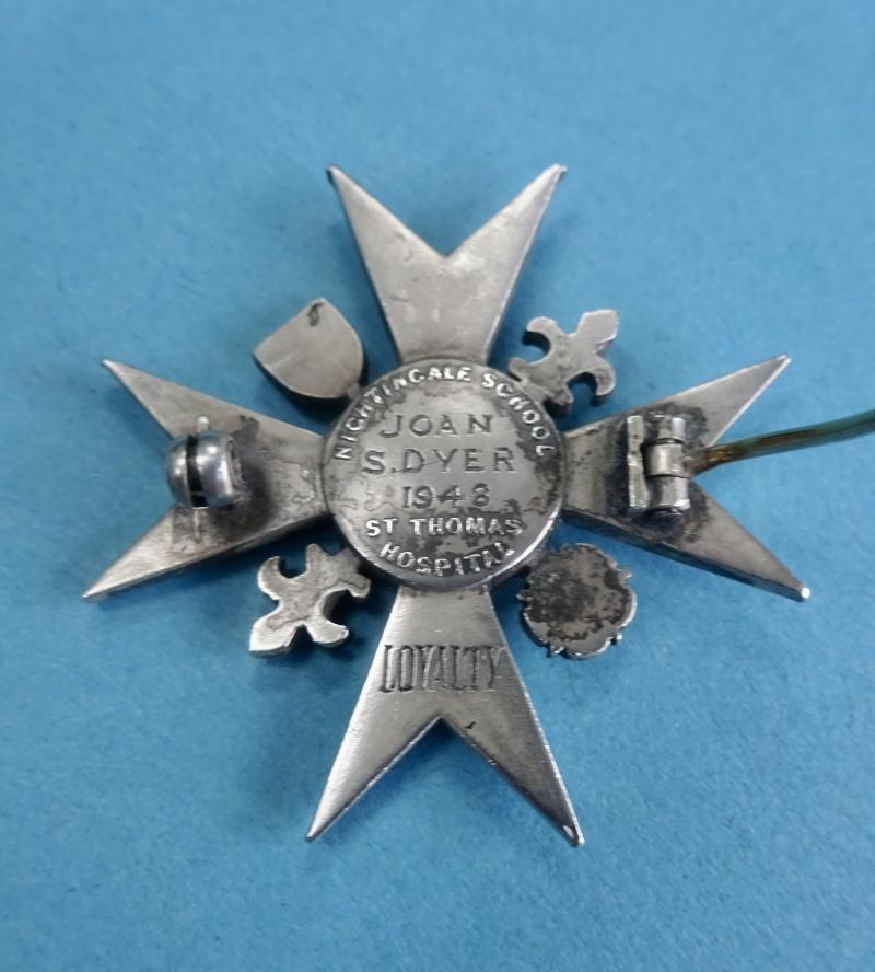 The pin, clasp and safety roller catch are good It is engraved to the rear Nightingale School St Thomas Hospital Joan S. Dyer 1948 Loyalty (Joan Saunders Dyer is shown as SRN 150354 having registered on 25.7 .47,being shown as having trained at St Thomas 1943-47)