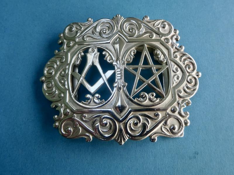A scarce and desirable two piece nurses belt buckle from the Royal Masonic Hospital.The main body of the buckle consist of a heavy convex scrolled design into which are set two panels in a voided centre.The first bears the square and compass,the second the five pointed star,both masonic emblems.This is a slightly later version of the belt which was awarded to nurses qualifying from the Nurse Training School,and is slightly chunkier than the earlier models.The second piece is the buckle clasp.Both pieces are hallmarked for Toye,Kenning & Spencer,Birmingham 1984.The rear is unnamed. Height 70mm Width 89mm