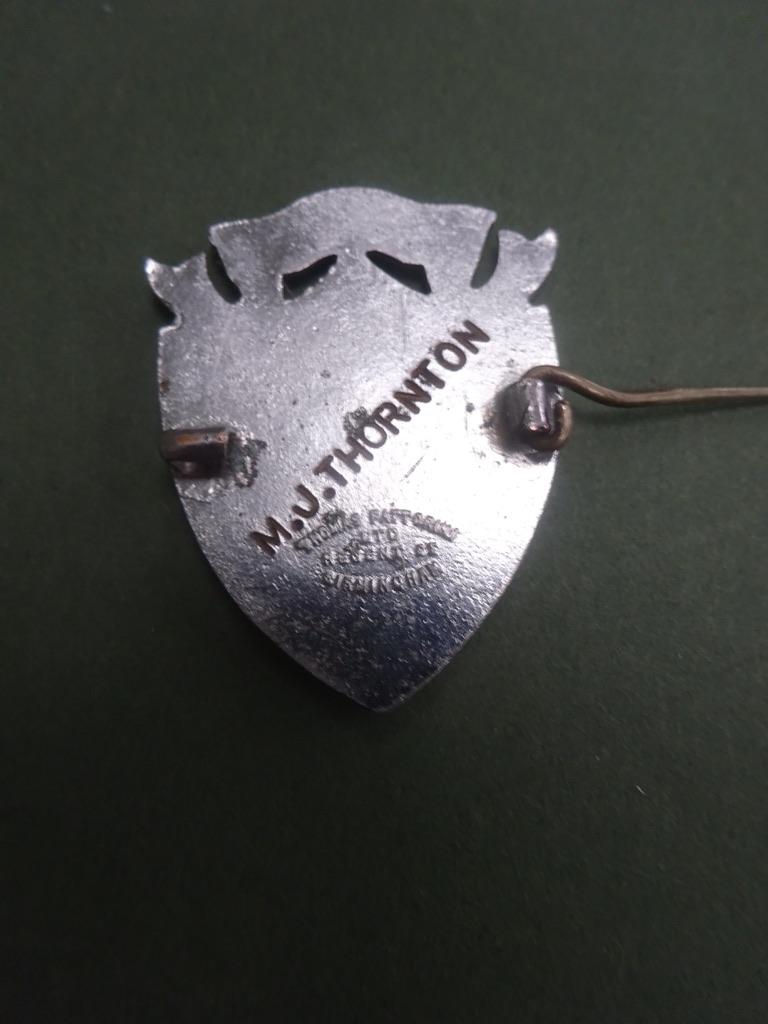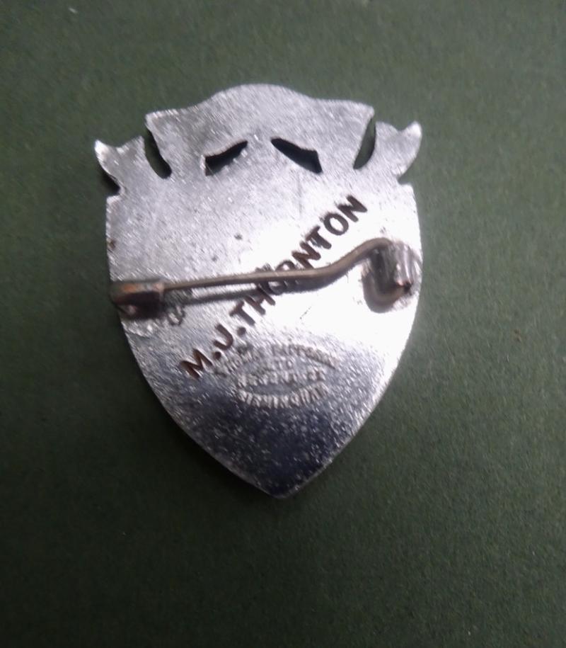 A base metal nurses badge for the Nurses League of the Leicester Royal Infirmary,dating to the 1940s.It features the intertwined initials of the Hospital topped by a scroll with their motto Unity and Honour and the year of its foundation 1903.In good overall condition barring several surface scratches. Pin and catch intact.Engraved to rear M J Thornton.(This appears to be Mary Joy Thornton who was living and working in Leicester in the 1940s) Makers mark for Thomas Fattorini ltd Regent Street Birmingham Height 40mm