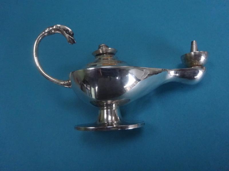 A lovely solid silver Aladdin style lamp,also known as the Lamp of Learning. A smaller version of the type of Lamp used in the annual Florence Nightingale Commemoration Service at Westminster Abbey.In America many schools hold a Lamp Of Learning ceremony and small china versions are given as graduation gifts.This one has a handle in the form of a snake, an emblem of healthcare