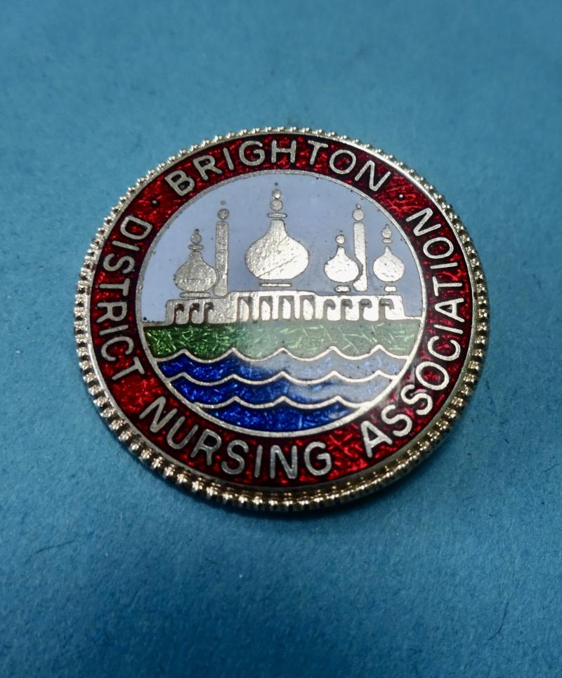 A base metal and enamel badge for the Brighton,Hove & Preston District Nursing Association.It was affiliated to the Queen Victoria's Jubilee Institute for Nurses and supplied Nurses for District Nursing.The badge features the Brighton Pavilion on a green lawn above the waves of the sea. Brighton District Nursing Association appears in Silver on red enamel around the edge.Condition very good,pin and clasp in good order.Makers mark for Thomas Fattorini Regent St Birmingham.Height 32mm