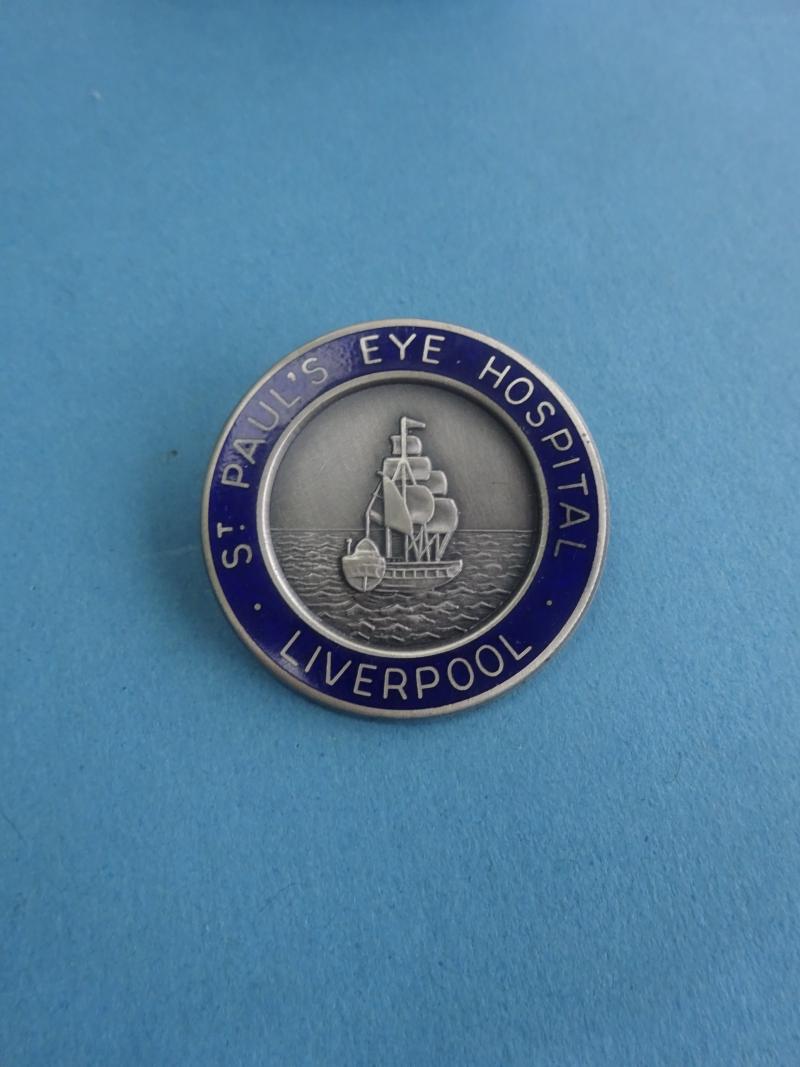 St Paul's Eye Hospital Liverpool. Originally founded in 1871,the later hospital was opened in 1912.The badge shows a ship in full sail,partly as a reference to St Paul,his blindness and subsequent healing and his many journeys by sea.The ship also denotes Liverpool's famous maritime heritage. In very good condition, with pin clasp and safety roller catch all good. Unmarked to the rear Silver hallmarks for TF Birmingham 1985 height 32mm