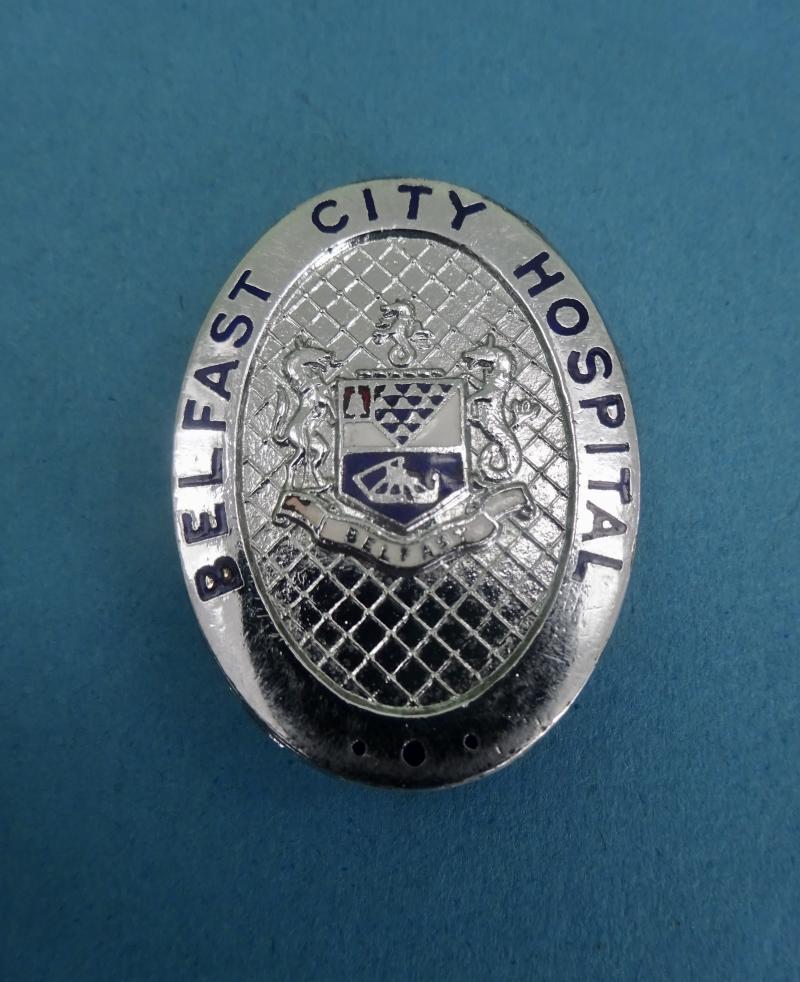 A white metal and enamel badge from the Belfast City Hospital.The design features the Belfast Coat of Arms,In generally good condition but with only minor surface scratches. Pin and clasp in good order .Marked to rear Toye & Co London.Height 38mm