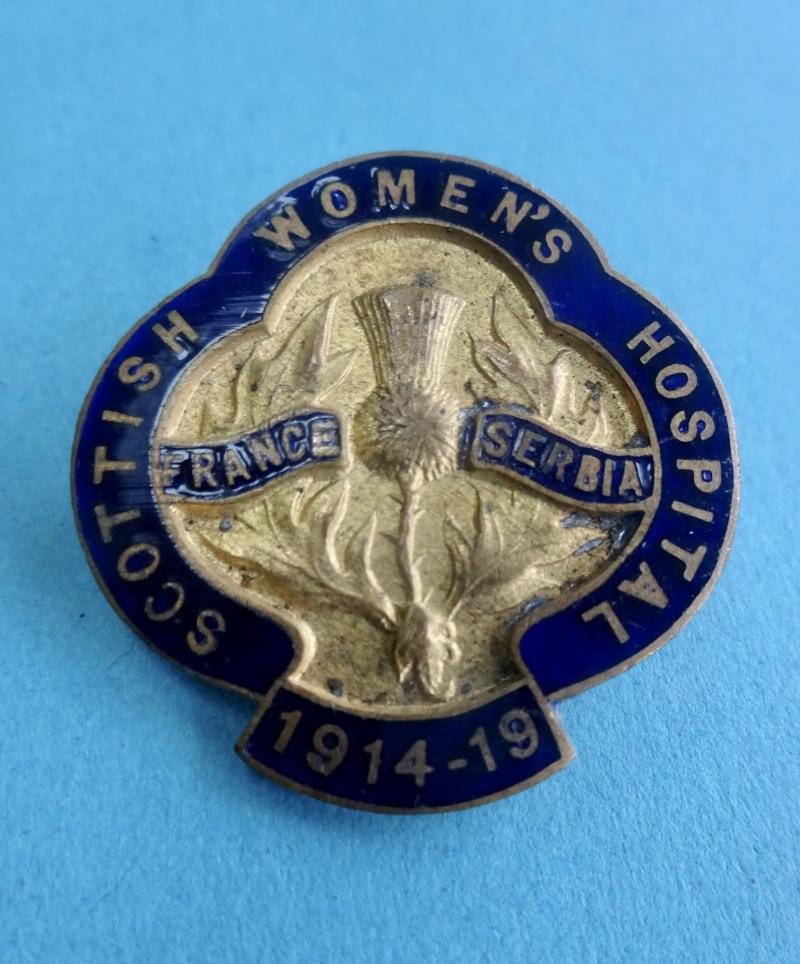 An extremely rare original brass and enamel badge for the Scottish Women's Hospital.Founded by Dr Elsie Inglis, secretary for the Scottish Federation of Suffrage Societies, it consisted of volunteer all women units who set up Hospitals in France, Serbia, Salonika and Russia. Over 1000 women from different countries served with SWH over the course of the war and their efforts saved countless lives.The pin back lapel badge bears a Scottish Thistle with two red banners with France and Serbia.Around the edge is Scottish Womens Hospital 1914-19. Condition is very good with no enamel damage .Pin and clasp intact, unmarked to rear.Height 29mm
