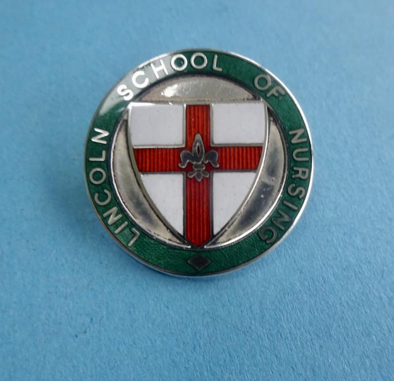 A silver and enamel Badge from the Lincoln School of Nursing.It features the emblem from the arms of Lincoln,namely a shield with red cross and central Fleur de Lys. The School of Nursing title is on a green enamel band to the edge.Very Good condition ,pin clasp and safety catch good.Hallmarked to rear F&S Birmingham1967 Height 28mm