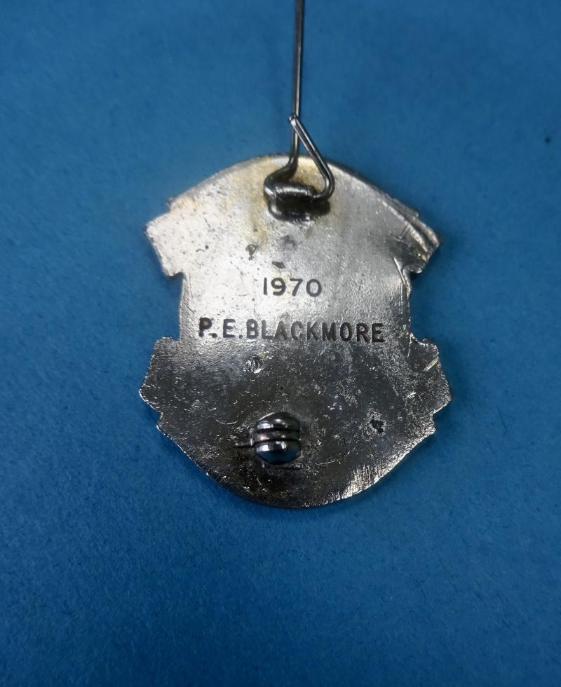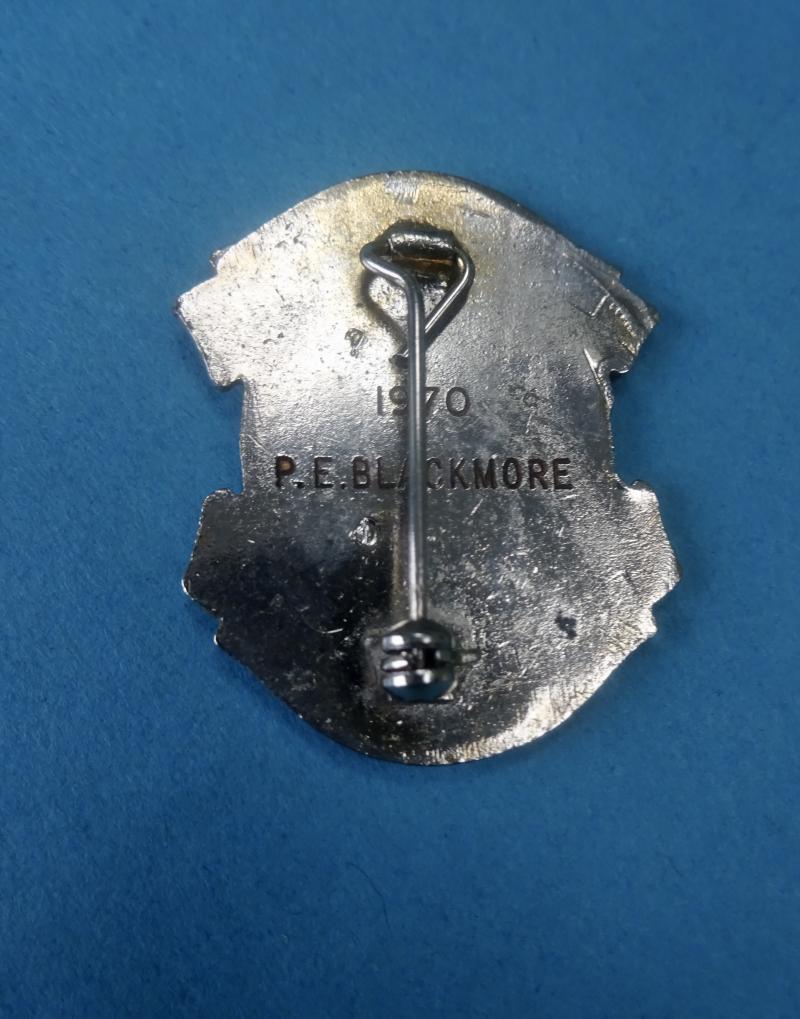 The badge shows Humanity aiding the Sick from a design by C J Doman (which also appears on Masonic Hospital Jewels.) In base metal with a gilt finish, condition is good.Pin, clasp and safety roller catch are all good. Named for P E Blackmore 1970