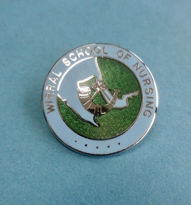 A base metal and enamel nurses badge from the Wirral School of Nursing based in Birkenhead during the 1970s.The design features a map of Wirral peninsular topped by the hunting horn emblem of Wirral,The light blue border denotes the Registered Nurses Training.Very good condition, pin clasp and safety roller catch all good.Makers marks for Fattorini Tel 021 236 1307 Height 30mm