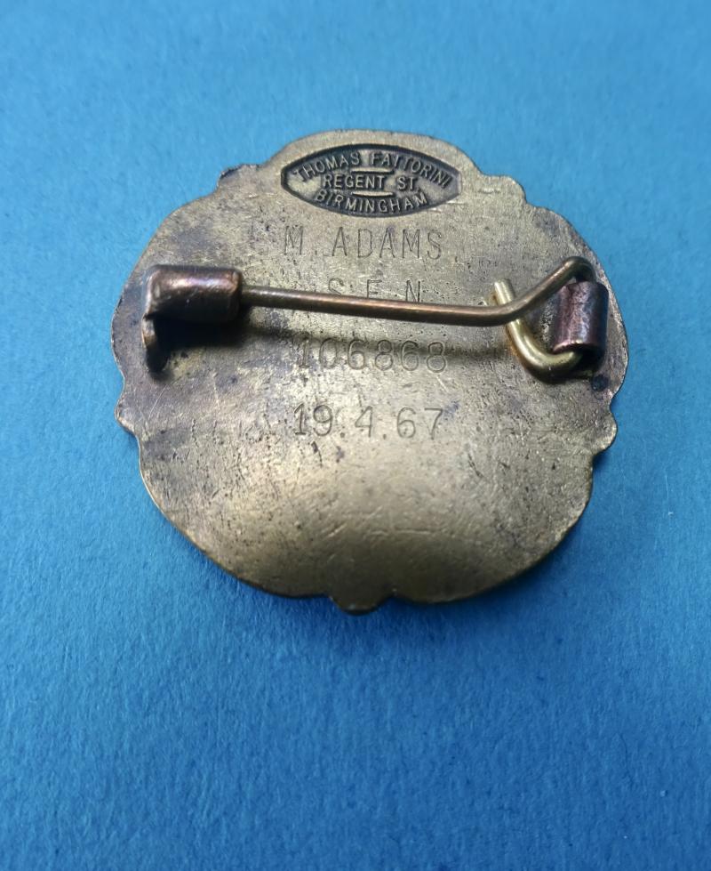 A good clean bronze and enamel State Enrolled Nurses badge from the General Nursing Council for England & Wales.In generally good clean condition .Pin, clasp and safety roller catch are good.Makers mark for Thomas Fattorini Regent street Birmingham,Engraved for M Adams SEN 106868 19.4.67 .Miriam Adams is shown as having trained at City General Hospital Carlisle