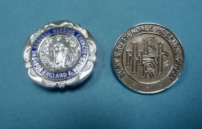 Bury & Rossendale Hospital Group, silver nurses badge and matching badges.