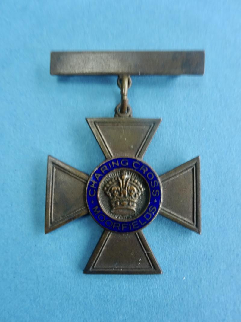 In 1933 Moorfields was affiliated with the Charing Cross Hospital in the Strand.and the badge was changed to reflect this, taking the form of the Maltese cross but with a central imperial crown around which on a blue enamel band is Charing Cross Moorfileds . A further affiliation in 1934 led to another change so this pattern would only have been issued for a matter of months and is therefore extremely scarce.