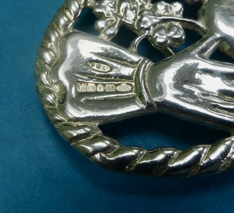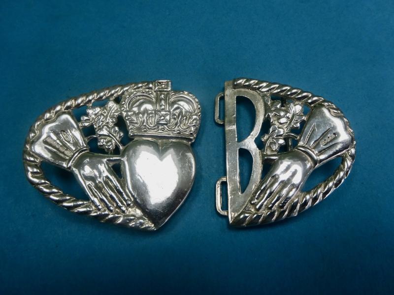 A lovely silver belt buckle in the form of the Irish Claddagh ring or brooch.This has three symbolic elements which are the Heart which denotes Love, the Crown denotes Loyalty and the Hands are a sign of Friendship. Often given as a token of love by the family , partner or friend. The dimensions are width 85mm height 55mm Weight 75gms . Belt loops and clasp are good.Hallmarked PM Ltd Birmingham 1993