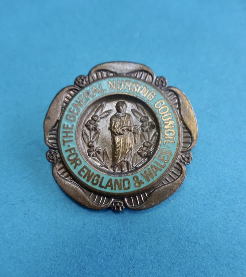 A bronze and enamel badge for the general Nursing Council for England and Wales for State Registered Nurse Training.In very good condition with pin clasp and safety roller catch all good. This is one of the post 1973 versions which is numbered but unnamed. SEN 246322 to rear
