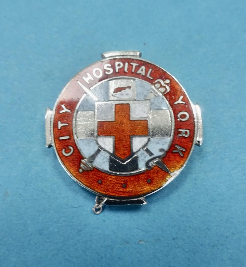 Another one of the many different badges issued for Nurse Training in the Hospitals of York. This is a silver and enamel badge for the City Hospital York.The design features a silvered Greek cross with an imposed central shield bearing a St Georges cross associated with York. A Sword and Sceptre are placed diagonally behind the shield.A Red border bears the legend City Hospital York. Good overall condition with only one very minor ding to the enamel at the base of the sword. Pin and clasp intact.Makers mark for Thomas Fattorini Limited Birmingham.Silver hallmarks for TF Birmingham 1951.