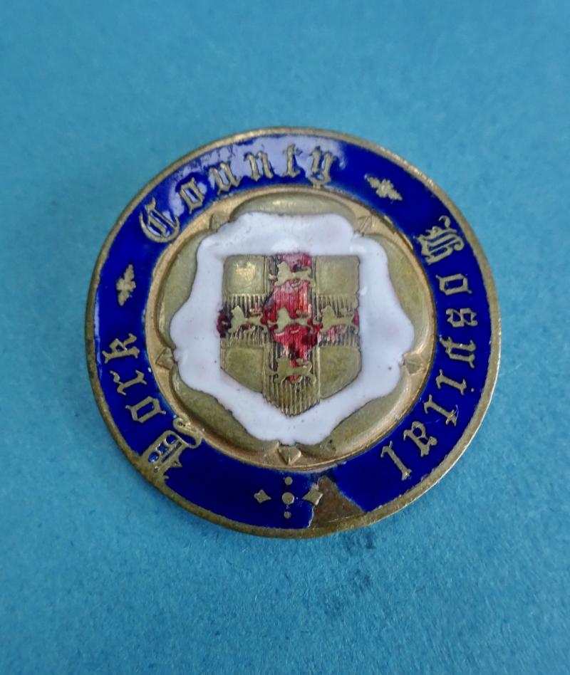An early brass and enamel badge for York County Hospital. The design features a white enamel Rose of Yorkshire on which a shield bearing the cross of St George emblazoned with five lions, the emblem of York. The Blue border bears the legend York County Hospital in old English lettering. Generally good condition but with some enamel damage as pictured , however the clasp is damaged and therefore cannot be worn.