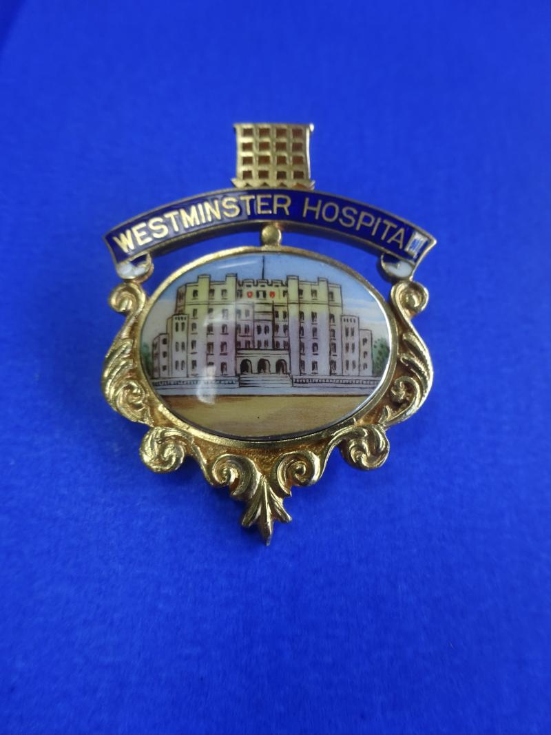 The next item is a superb cased enamel badge which I believe may have been awarded to Gwyneth for her role as Matron by the Westminster Hospital.It has a central enamel plaque showing the hospital building below a bar with Westminster hospital, topped by the Westminster portcullis.Unmarked to the rear.Pin and clasp good.