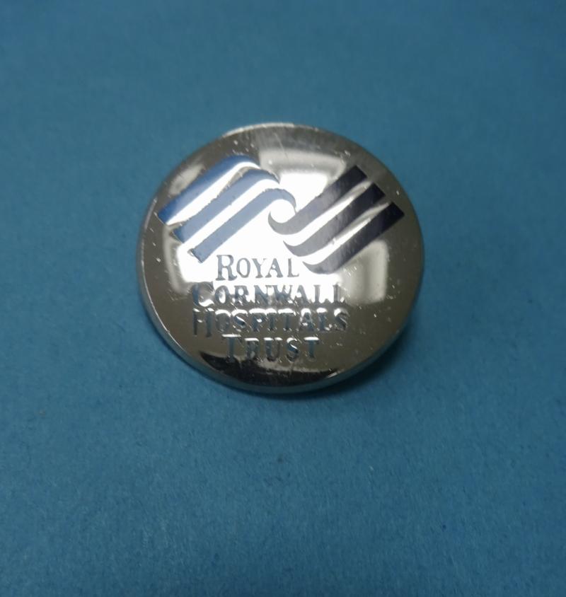 A modern staff member badge for the Royal Cornwall Hospitals Trust. Pin back fixing in good order.
